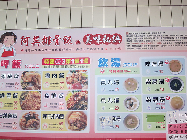 ▲阿英排骨飯有很多組合,只要有組合就稱為特餐,特餐可以點三樣菜,並可以補差價點一碗湯,像我就點了魚排飯+貢丸湯,85+"5",沒錯,可以特價加點湯。