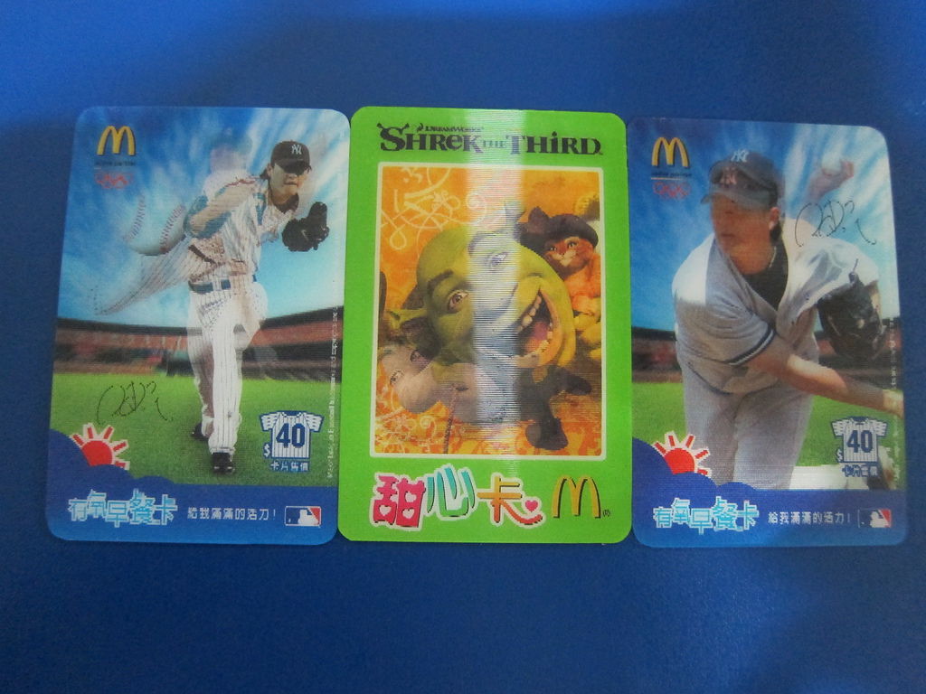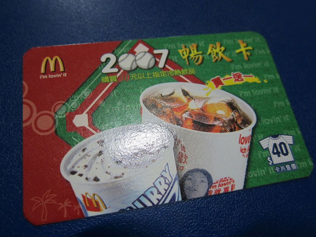 ▲2007的卡片就多了,當年也是王建民爭霸大聯盟的一年,麥當勞為他出了兩款變身的有氧早餐卡,一樣是買堡送飲料。同年度還有暢飲卡,飲料可以買一送一。接著就是史瑞克所帶出的甜心卡,買A送B就此展開。