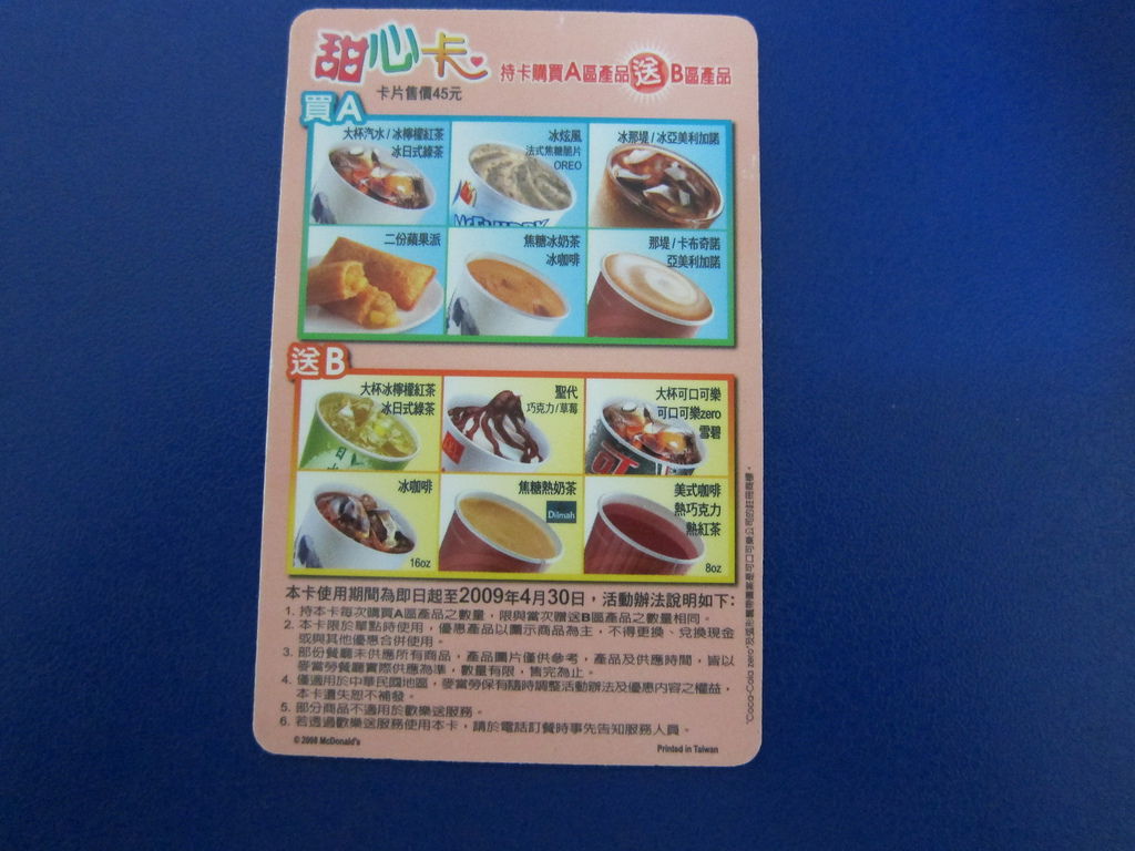 ▲2009甜心卡再度出動,買A送B就有MCcafe可以挑選了,也出現食物在A選項,麥當勞首度照顧了單身族。