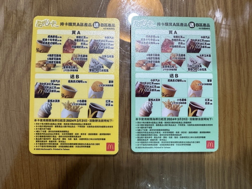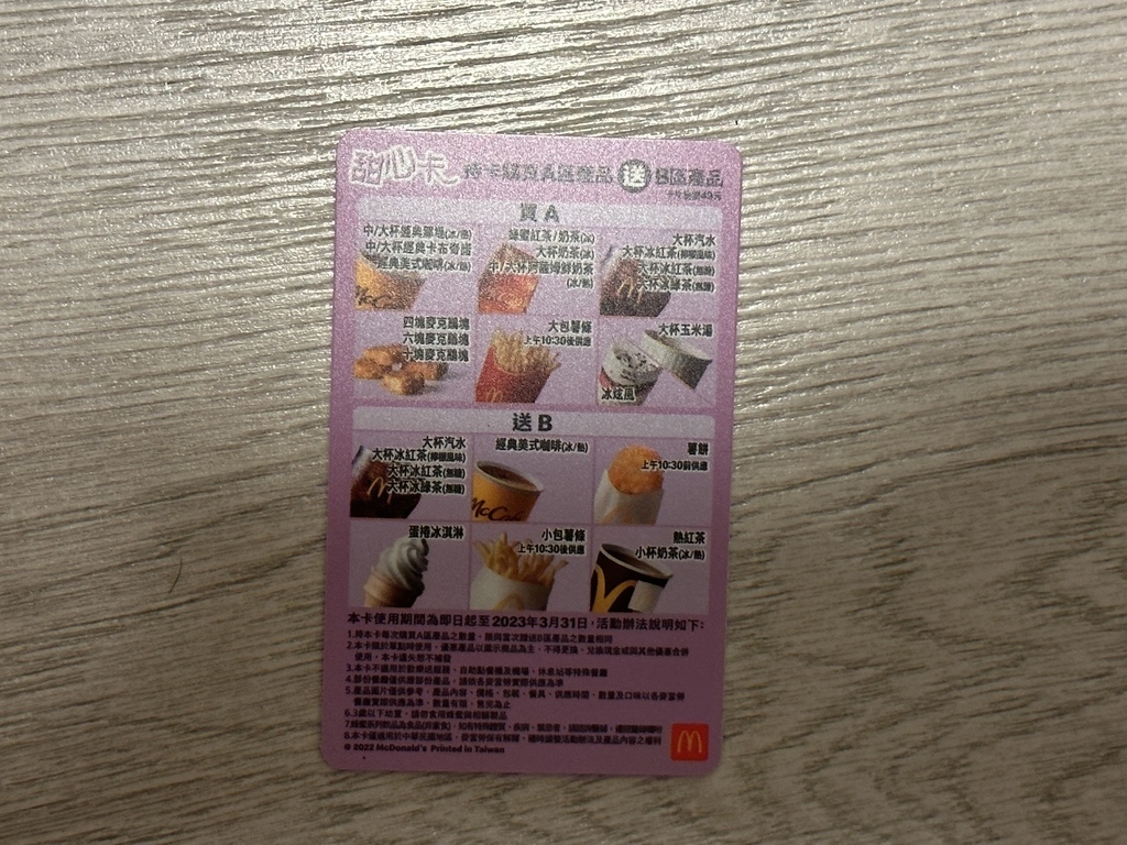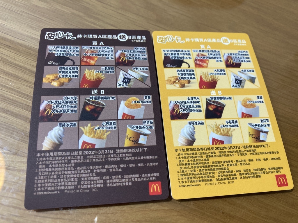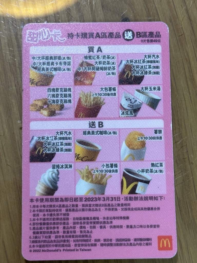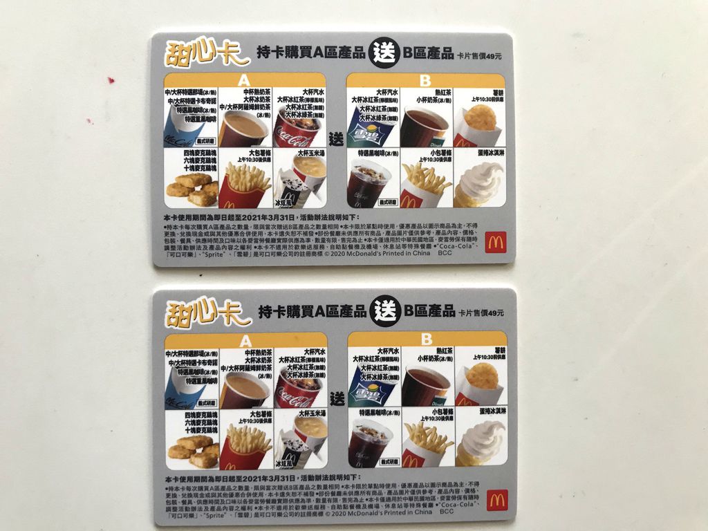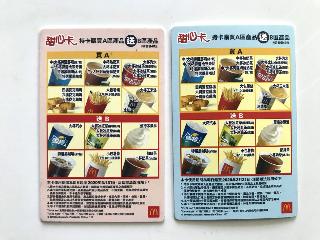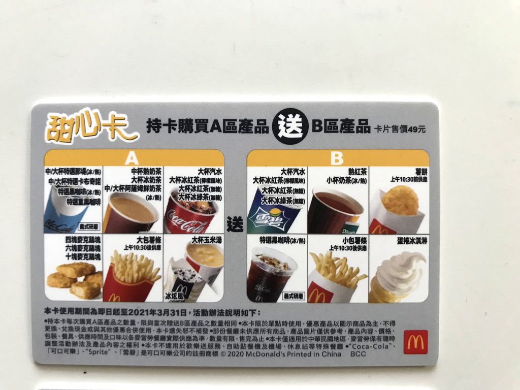 ▲2020甜心卡($49),又恢復成橫式卡片,今年新增了薯餅加入買A送B的行列當中。