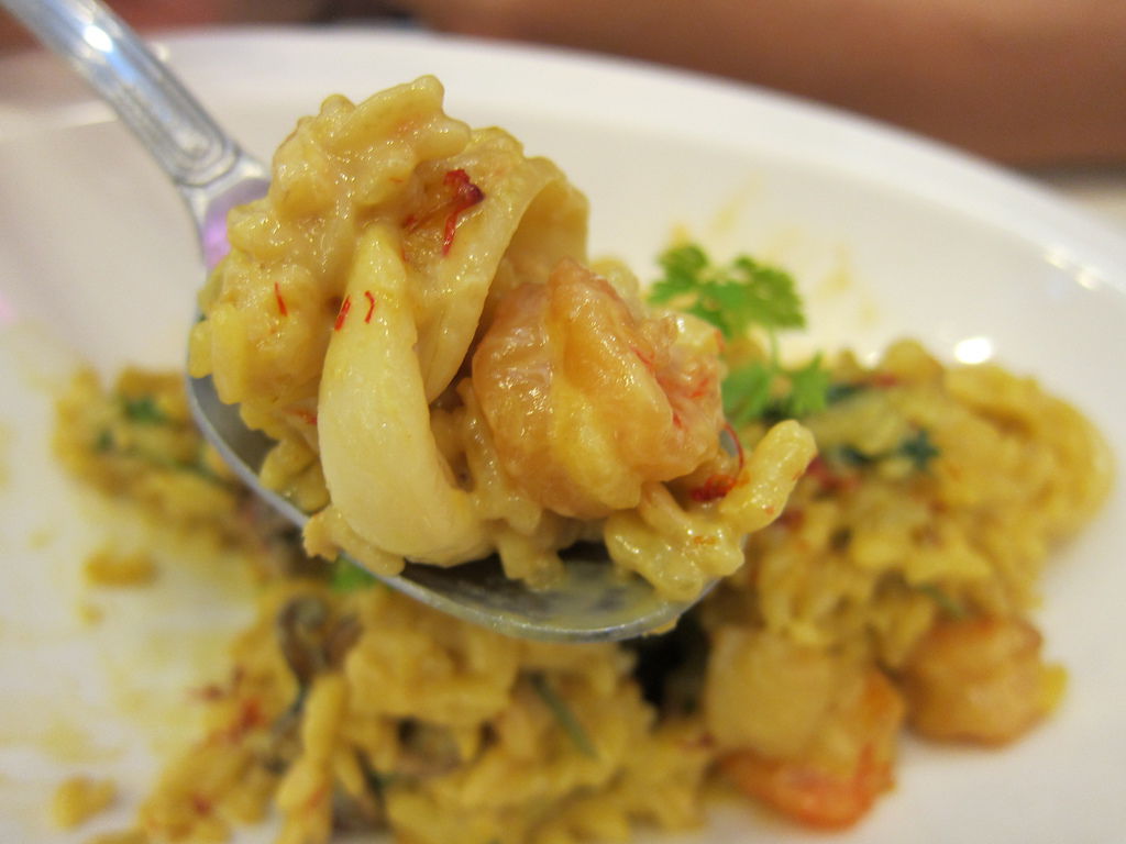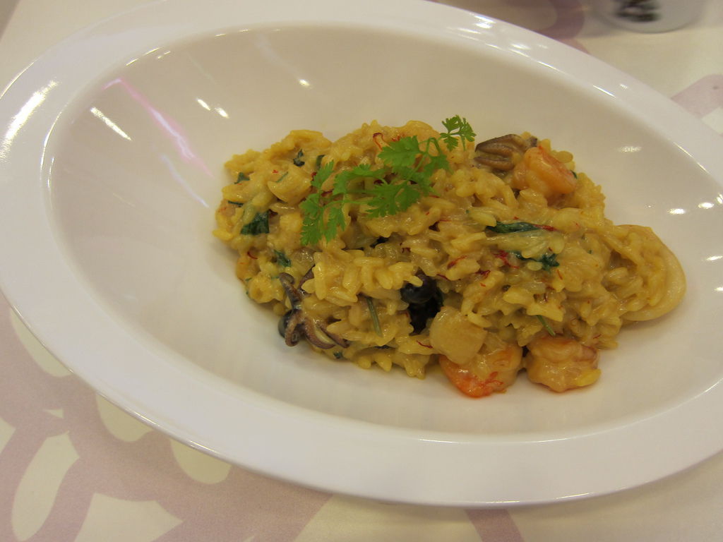▲西班牙海鮮燉飯($200),看起來份量很少?其實是盤子太大,看起來少少的燉飯,所舀起的每一口都是充實飽足感,海鮮方面Open將也不吝嗇,大方給予來到這裡消費的顧客,其中這道料理含有番紅花,孕婦不能食用喔。