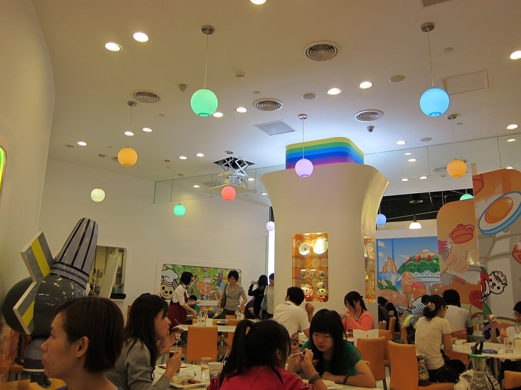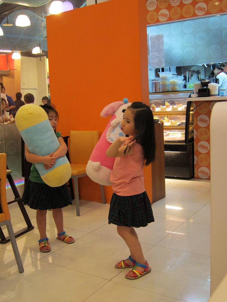 ▲這邊除了店面全是家族成員以外,還有許多Open家族絨布娃娃在四周等著用餐的客人抱來陪伴。