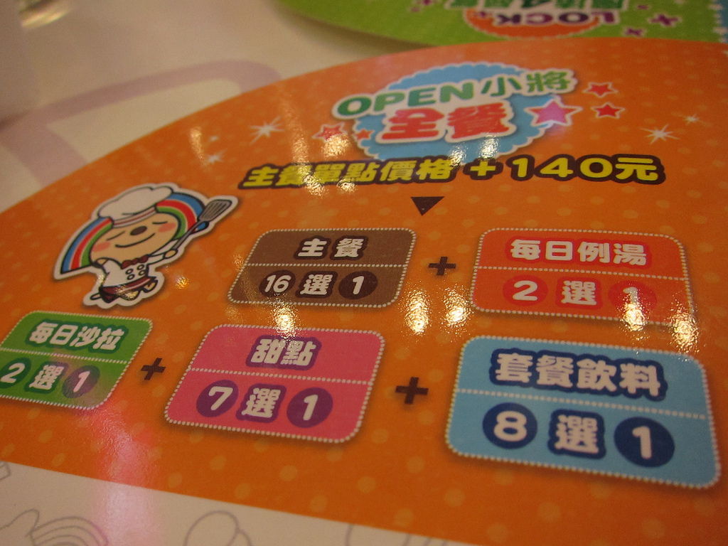 ▲菜單有三種點餐方式,第一種是open將全餐,在菜單中點選一個主餐,搭配其他附餐只要主餐+140元。