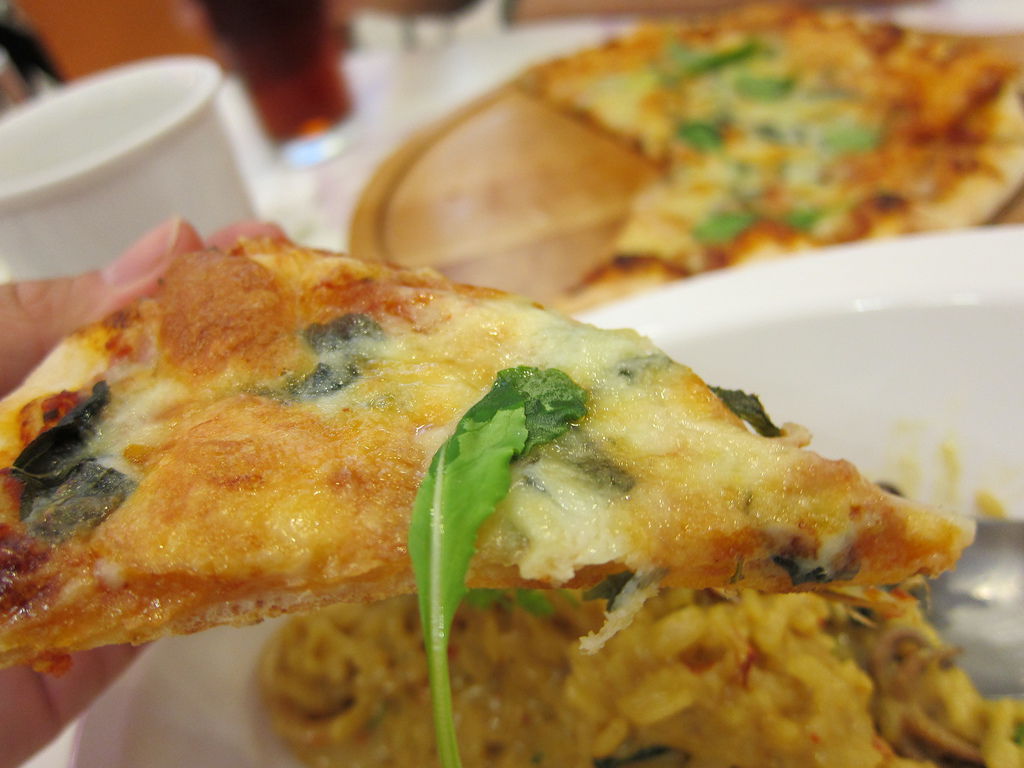▲瑪格烈特Pizza($160),瑪格烈特Pizza在一般披薩店都看得到, 尤其現在窯烤pizza一堆,但這邊的瑪格烈特Pizza餅皮特別香脆甜口,醬汁、羅勒以及特製醬汁都被封在起士裡面,讓這簡單的pizza吃來原味十足。