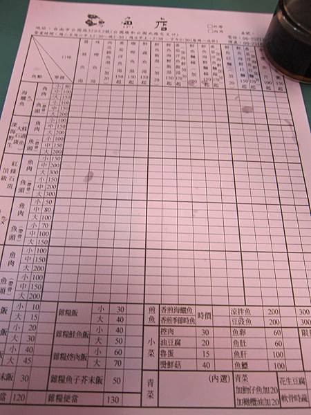 ▲粉紅色菜單,表格式的點菜相當方便,上面是菜名,左邊為料理方式搭配價格,一目了然。