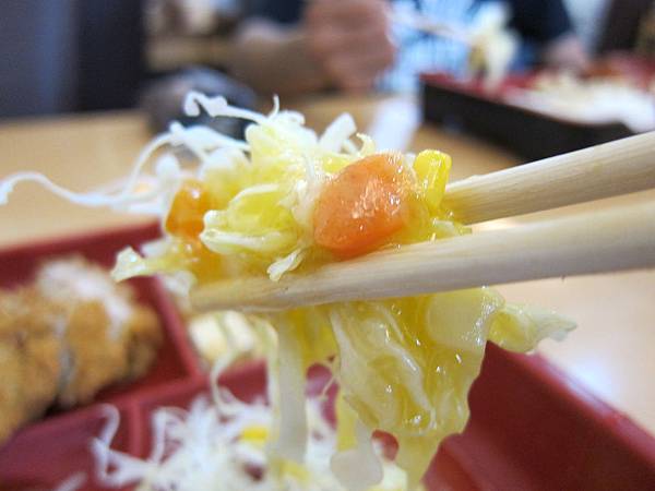 ▲高麗菜絲,沾了一些酸酸的醬,應該不是客家人的桔醬,但很下飯,酸酸的口感配在飯和豬排上可以一口接一口。