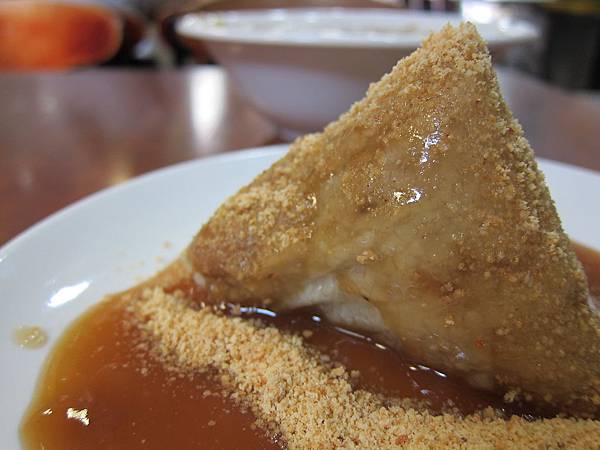 ▲肉粽($30),馬汀看到肉粽時,心裡的想法是...這是一口粽?個人認為分量有點少,內餡有豬肉與鹹蛋,口感適中,要加花生粉比較好吃,不然味道可能不太夠。