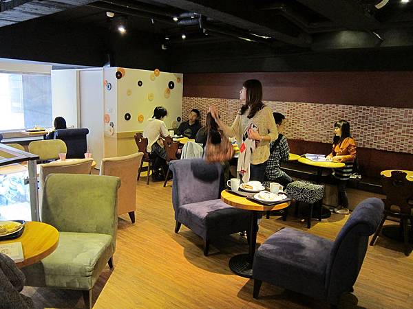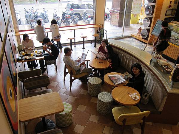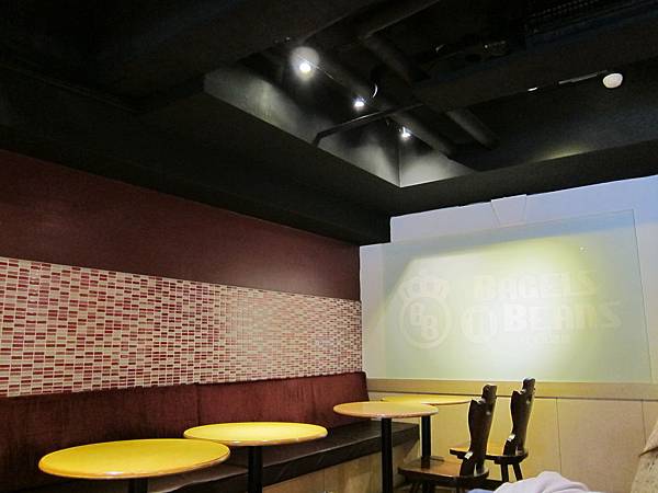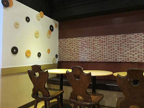 ▲1樓用餐環境,牆上還有個極具普普風格的貝果意象,感覺到這裡好像都是圓形的圖案,就連嗚繳都是圓角的,是因為本店賣貝果嗎?
