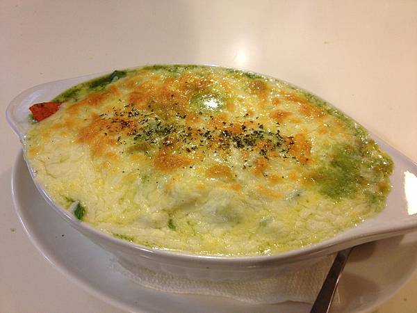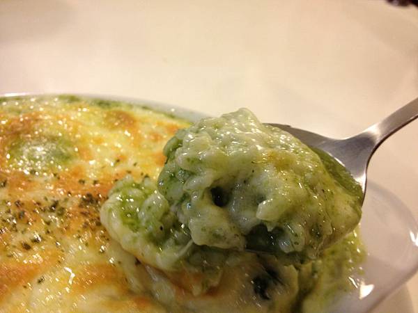 焗烤青醬雞肉燉飯(105),一送上桌,濃厚的起士味馬上撲鼻而來,讓人食指大動,濃郁的青醬與燉飯口感很搭,讓人一口接一口停不下手中的湯匙,份量很大的青醬雞肉可以讓你今天飽足一頓。