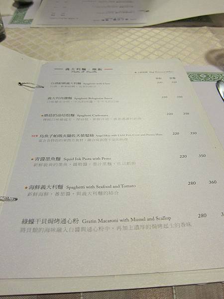 ▲菜單,套餐均附前菜、沙拉、湯品、麵包、紅酒、飲品,除了有義法精緻套餐以外,還有義大利麵、燉飯,看你比較愛哪種料理囉。