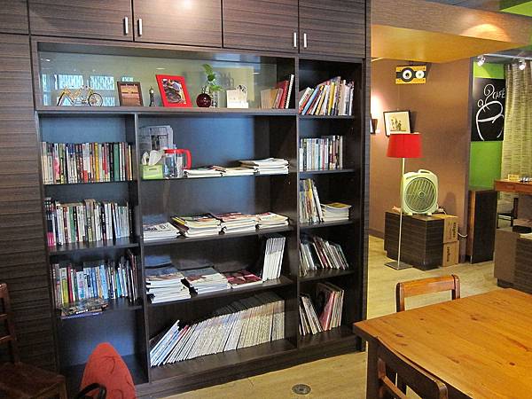 ▲超過200公分的大書櫃裡有小說、雜誌、財經書籍,如果不能滿足你,當然,帶本自己愛的書來咖啡鳥,埋首在咖啡鄉裡,相信k書更有勁。