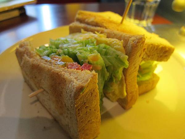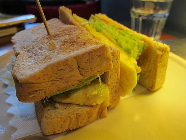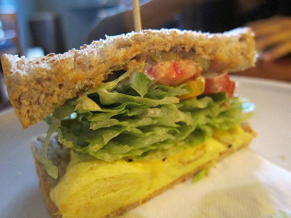 ▲香煎軟蛋加起司+飲品一杯($125),供應時間只有早上8:15~11:30的清早餐-全麥吐司三明治。超大方的生菜全部壓在麵包夾心裡,酸酸甜甜的番茄沙拉加上熱透的起司與煎蛋附著在一塊,營養又好吃。