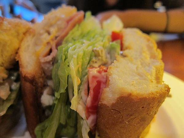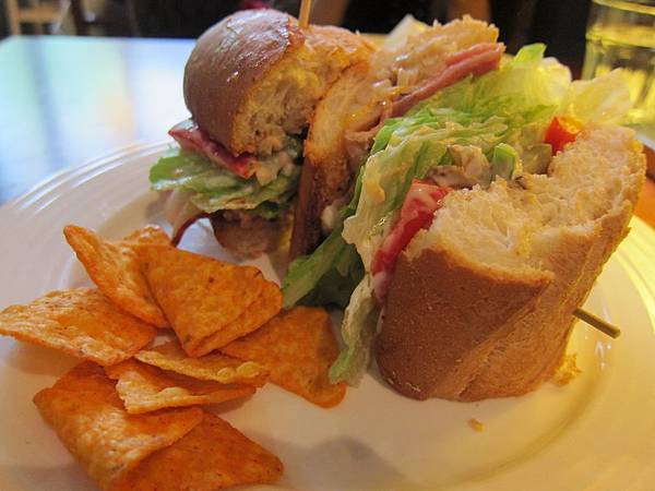 ▲蘑菇培根三明治($200),可點附95元的飲品,而麵包有法國麵包、全麥吐司、佛卡夏,可供選擇,當天我們點了脆皮又有嚼勁的法國麵包,這三明治無法一口咬下,不然裡面的蘑菇和培根可次會爆漿到盤子上跟你說Hello。你已為旁邊是多力多滋嗎?沒錯!就是多力多滋,好意外阿,早餐吃三明治配多力多滋,意外的搭。