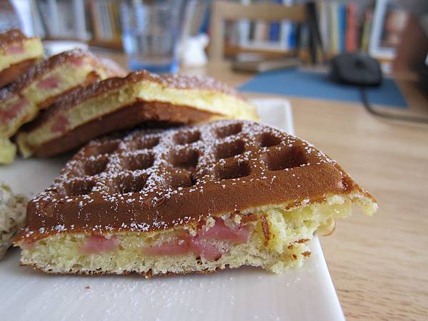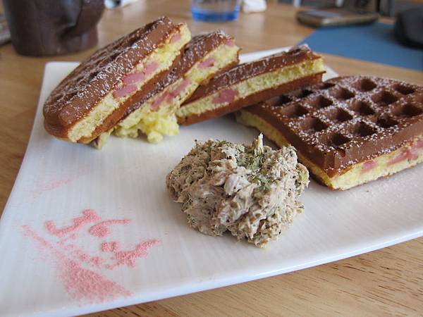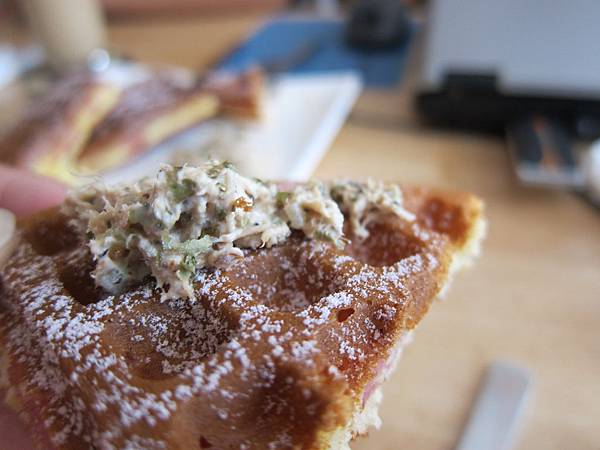 ▲鮪魚鬆餅($150),厚實的鬆餅內層夾著火腿丁,在鬆餅的上層抹上鮪魚,飽足感與海鮮直逼味蕾的極限。