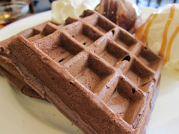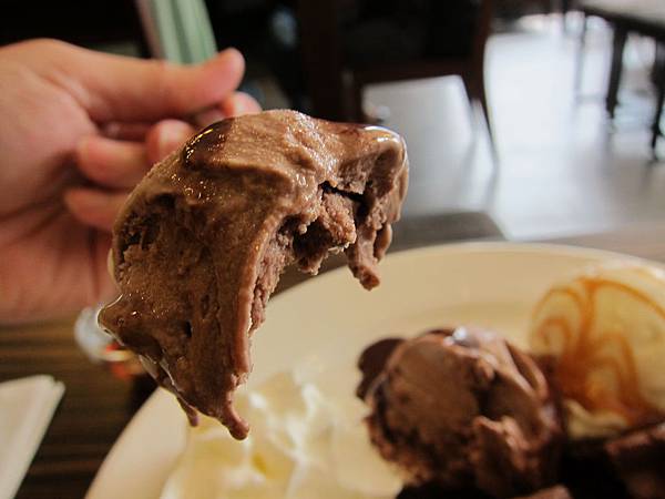 ▲法式香草冰淇淋淋上焦糖醬、巧克力冰淇淋淋上可可醬。好滑嫩的冰淇淋,碰上熱熱的鬆餅融化特別快,趕快在融掉之前吃完,冰淇淋淋上星巴克的糖醬太好吃了。