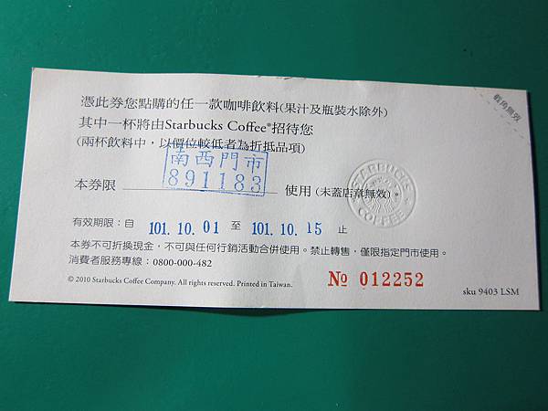 ▲衝著台北星巴克南西店重新開幕推出了冰淇淋鬆餅,馬上殺到台北點一份試看看星巴克冰淇淋味道如何。店裡裝潢氣味還沒有全部散去,咖啡味與裝潢味道混在一起聞起來有點詭異。點冰淇淋鬆餅因為是現做的必須領取號碼牌等待夥伴幫你送餐來,點鬆餅餐還送買一送一券喔。