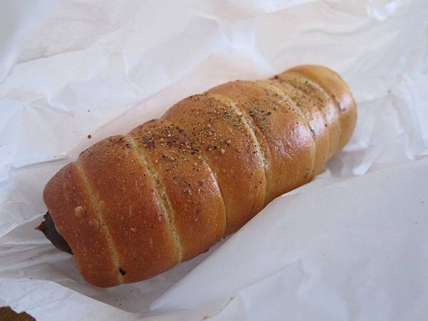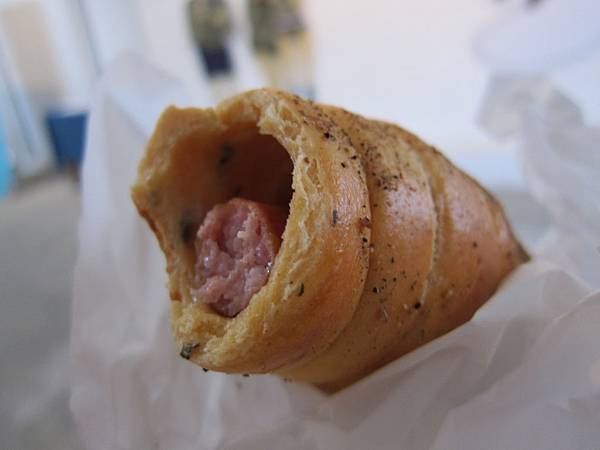 ▲香腸貝果($60)。味道偏辣的香腸,帶著濃濃煙燻味,咬下的肉汁辣又不嗆,又軟又脆的香腸配著外頭充滿嚼勁的貝果,都市風味十足。