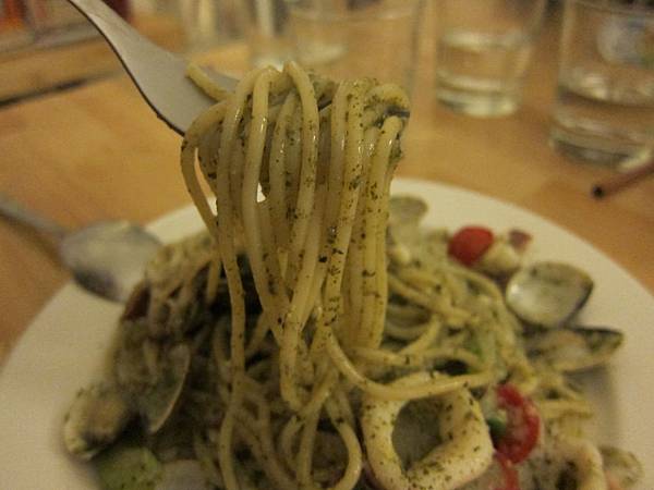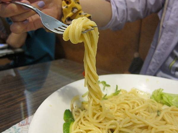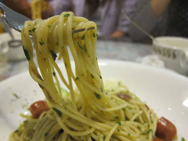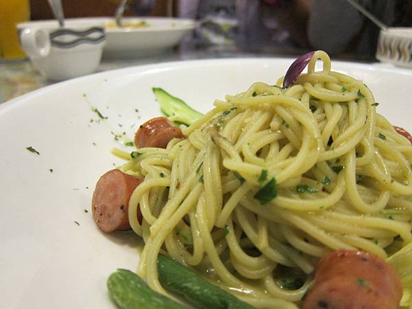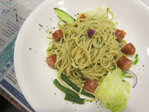▲香料德國香腸青醬麵($129)。脆到噴汁的的德國香腸與滑溜麵條一起入口,非常過癮,有層次的口感會覺得老天爺沒有虧待你啊。
