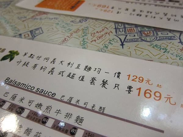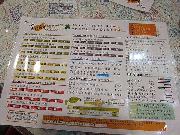 ▲花俏的菜單,以顏色來區分嫩煎、青醬、紅醬等麵類,選定口味後再來選麵條,光是麵條就五種可以選了。每款餐點都129元,升級套餐169元,套餐有濃湯和麵包,其實滿划算的。
