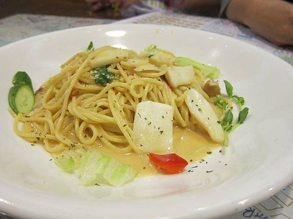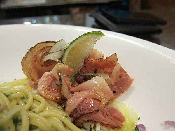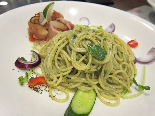 ▲炭燒培根裹洋蔥卷青醬麵($129)。這邊青醬不屬於整晚青筍筍的那種醬汁,而是較淡的提味,炭燒培根夾帶清爽洋蔥很對味。