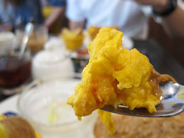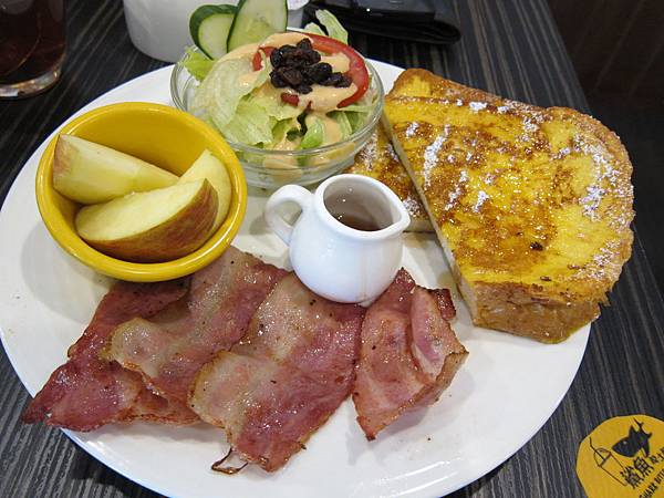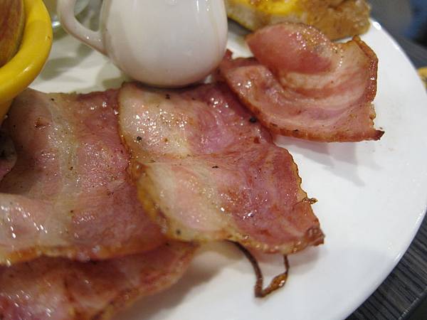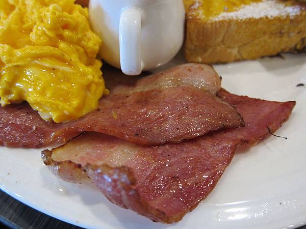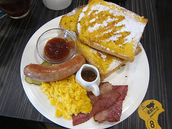 ▲白腸雙拼炒蛋布丁吐司莎莎醬($160)。培根、雞蛋、土司所形成的早餐組合,加上Q彈香腸與沾醬讓人食指大動阿。