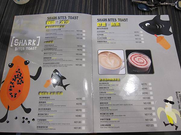 ▲活潑菜單上呈現照片與餐點,像是咖啡冰沙、樂活早餐、蜜糖鯊魚等各式料理,價格多在150元上下。