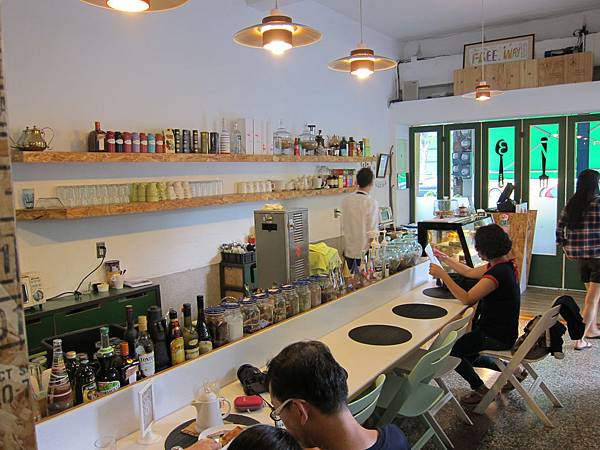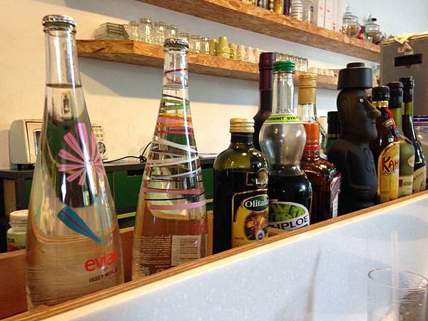 ▲一樓有櫃檯、吧台與冰箱,在吧台用餐雖然位子不多,卻可以看見很多老闆縮收藏的Evian礦泉水,各式的玻璃瓶讓人好想帶回家收藏呢!