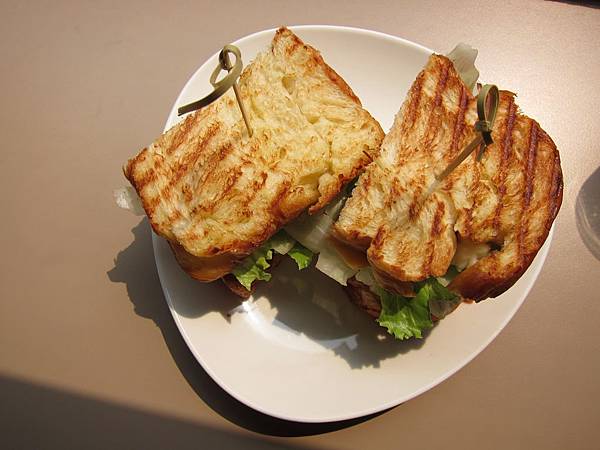 ▲里肌豬肉三明治($150)。早午餐店必有的三明治,今天點的里肌豬肉三明治,裡頭的里肌豬肉跟整個三明治比起來真是薄片阿,大約10分之1的厚度,其他的10分之9是酸黃瓜、芥末醬、番茄、生菜,這麼候真的很難食用呢!