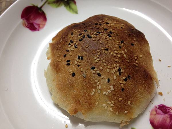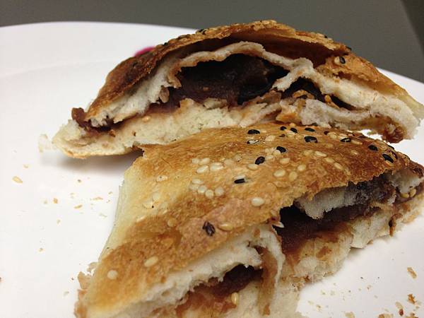 ▲紅豆燒餅($15),吃芝麻,哪有不掉燒餅的?大家就別在意掉芝麻啦。紅豆味道的燒餅皮脆餡厚,通通15元,是不是很便宜阿。