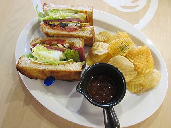 ▲嚕嚕黑胡椒牛肉三明治($180),有點辣辣口感的牛肉薄片,配著外頭脆趕三明治,其實還不錯,這邊把薯條換成洋芋片了?多力多滋、洋芋片都出現過,下次會有可樂果嗎?