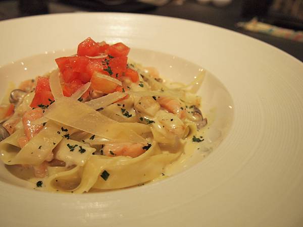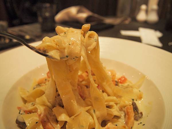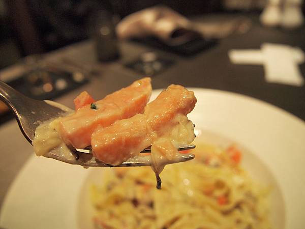 ▲奶油煙燻鮭魚義大利鳥巢麵($320),單點的義大利麵,濃厚的奶油和於嚼勁十足的寬版麵條當中,配著大小適中的鮭魚塊,一盤義大利麵就很夠味了。