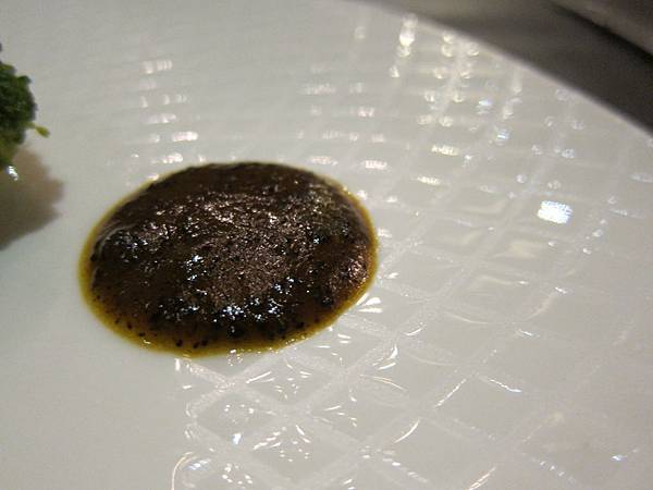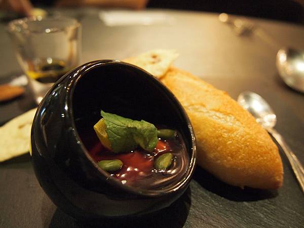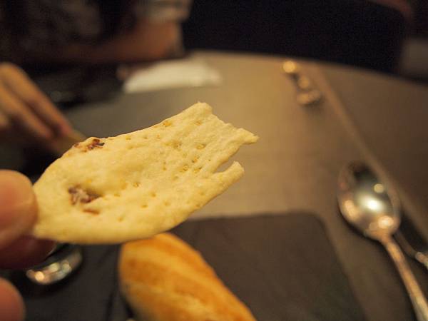▲法國小圓麵包初榨冷壓橄欖油與粗海鹽、開胃小品、土魯斯薄餅,開胃菜中的麵包沾海鹽令人印象深刻,鹹味帶出的甜味與麵包特別契合,而麵包口感並不鬆軟,而是咀嚼性取勝的法式麵包,雖然有各種沾醬,但是粗鹽讓我覺得好好吃。