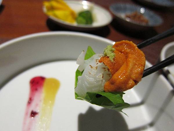 ▲海膽軟絲一口吃下濃郁海膽馬上化開,搭配鮮甜且刀工如畫一般的軟絲的非常對味,這可是很受歡迎的一道小品喔。