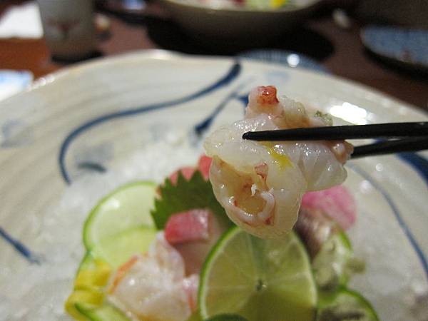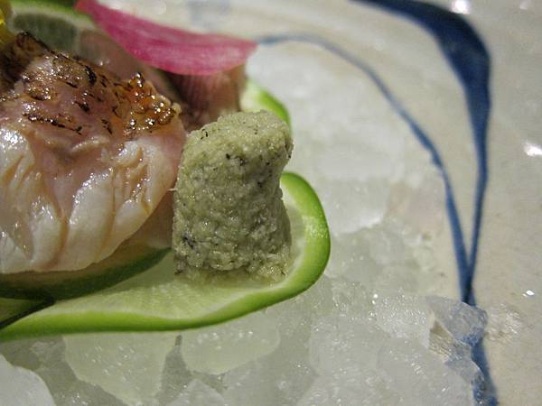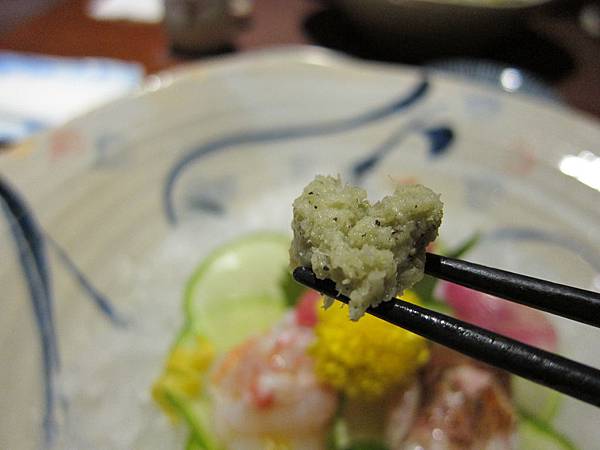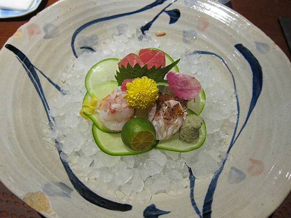 ▲鮪魚、龜山島甜蝦等組成的美妙生魚片,芥末口感與一般市售差很多,這邊沒有嗆辣的味覺,而是清爽的口感,一旁的小菊花花瓣可以灑入一起享用。