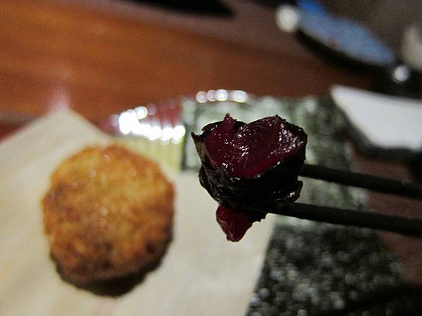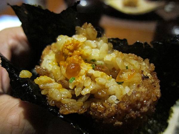 ▲海膽鮭魚卵烤飯糰、紫蘇蘋果,裹上海苔片搭配裡頭的獨門醬汁外脆內軟,會讓人一口一口吃個不停。