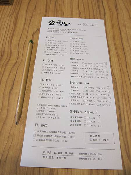 ▲菜單,店內低消100元,菜單上有朝食、洋食、和食等不同的餐點組合,洋食為套餐式,附優格、沙拉以及飲品,朝食也是套餐式,附餐前飲、茶碗蒸、沙拉以及飲品,都是五種飲料則一,更換飲品為半價優惠。