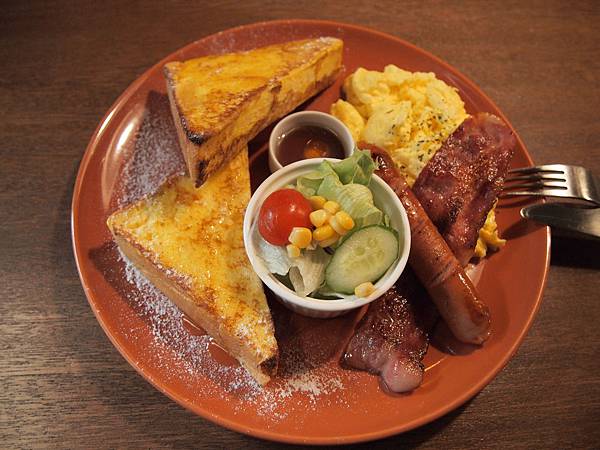 ▲日向早餐($160),法國吐司、炒蛋、培跟、香腸、沙拉,肉食性的朋友就要這道了,有培根也有香腸,脆又多汁的香腸令人食指大動,另一邊灑上糖粉的法國土司則是令人回味無窮,想再續一份吐司阿。