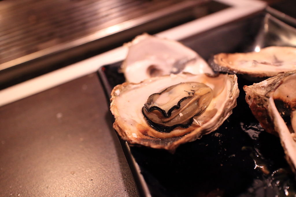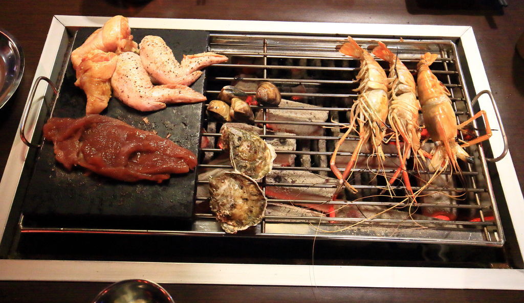 ▲鮮蚵、蛤仔還有鮮魚和花枝,新鮮的海鮮烤下去就知道,鮮美無比的湯汁劈哩啪啦的冒出來,不趕快處理可是漫到鍋底,非常浪費喔。甜美的鮮魚則是烤熟味道就很美味,雖然店家強調要灑上鹽巴,但我覺得原味的也非常好吃。