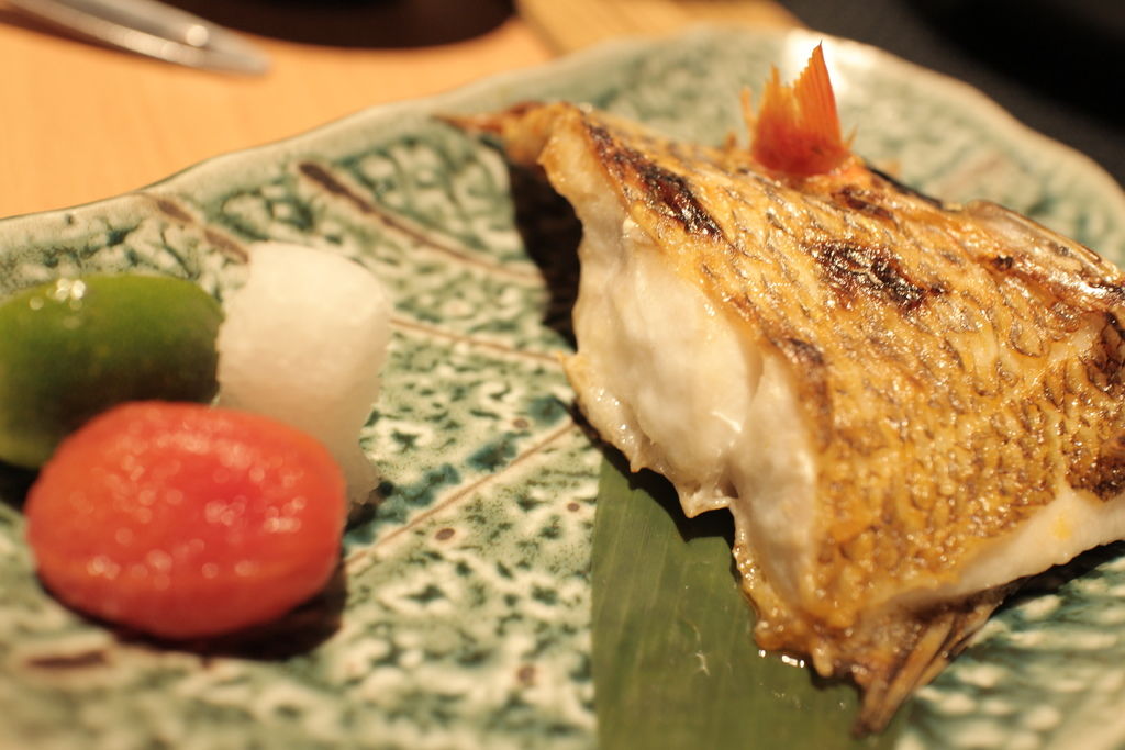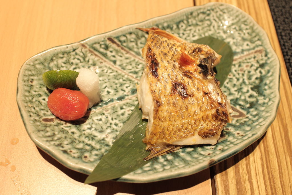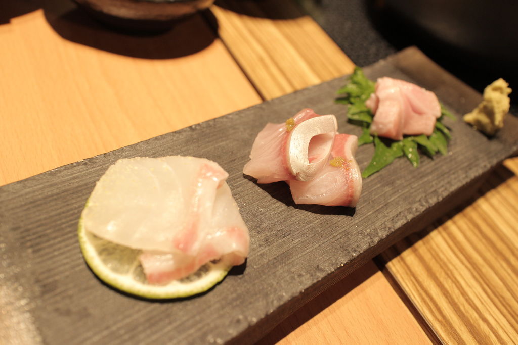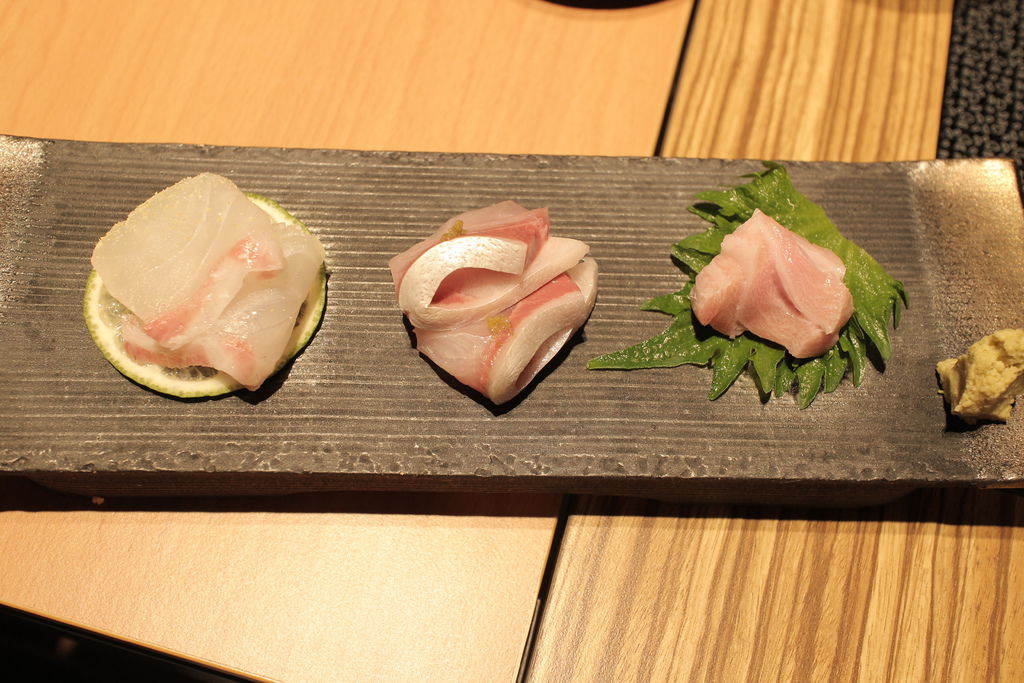 ▲刺身三品《鹿兒島真鯛、鹿兒島間八、大分縣鮪魚大腹》,油脂分部猶如蜘蛛絲的大腹一口咬下油汁四溢,滿口的鮮甜魚油就這樣散開來,跟後來吃得鯛魚口感扎實相較,這份三品以截然不同的口感呈現。