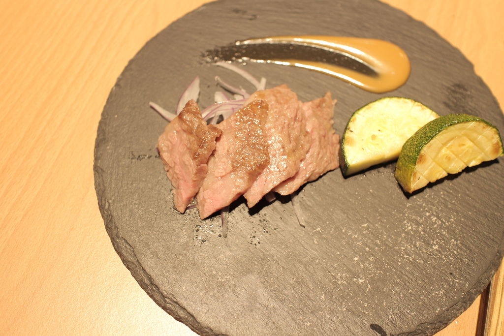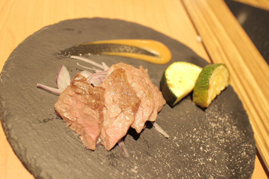 ▲Prime牛小排炸櫛瓜,牛肉本身沒有多餘調味,肉質鮮腴、又富有均勻油脂,輕沾一點岩鹽就可以享受到肉質鮮甜的滋味。