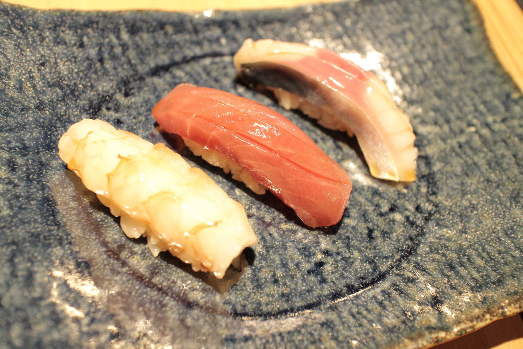 ▲握壽司《赤蝦、黑鮪赤身、長崎青花魚》,鹽烤常吃到的青花魚在這邊以生魚方式呈現,Q彈甘甜的方式也是很棒的味道,加上豐美生鮮的赤蝦與黑鮪,以這道做為完美的結位非常適合。