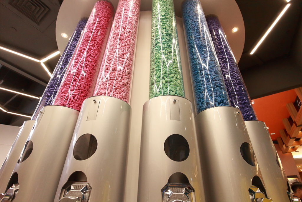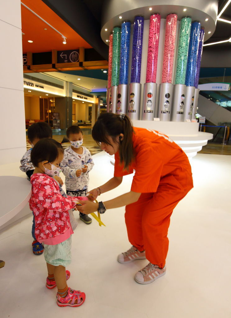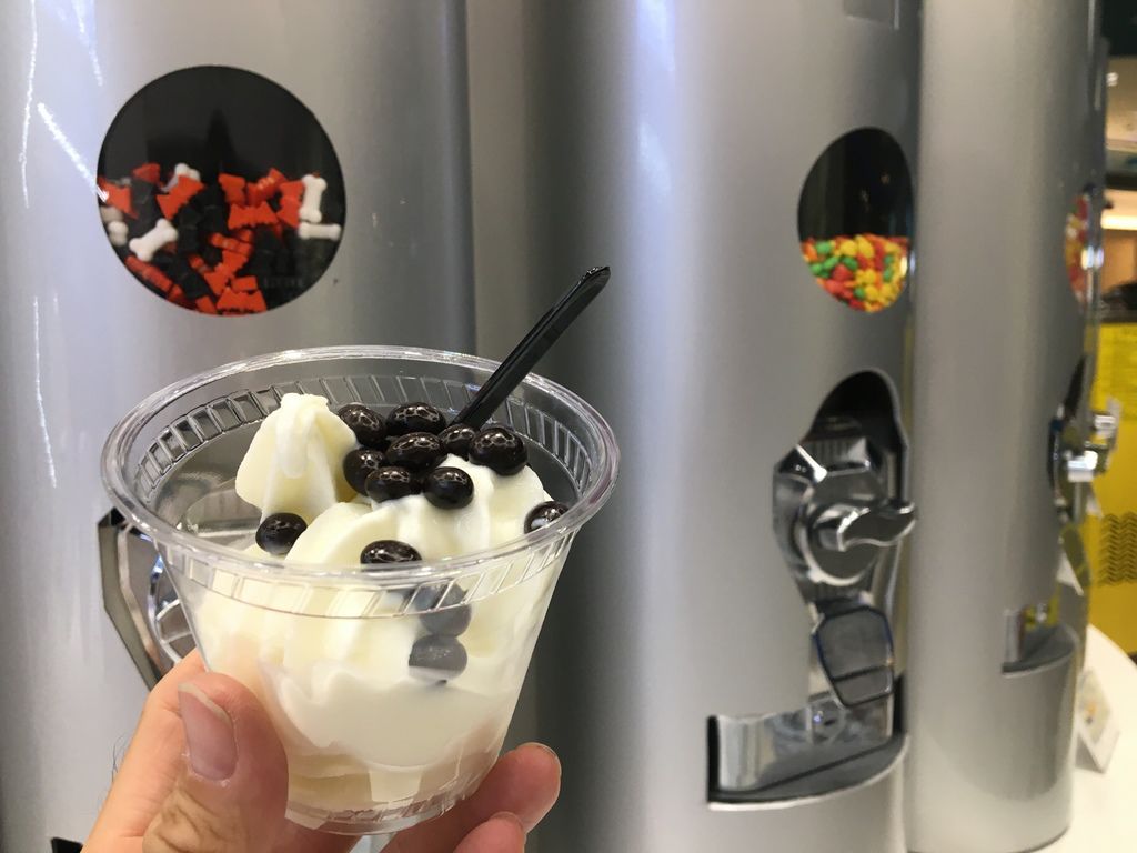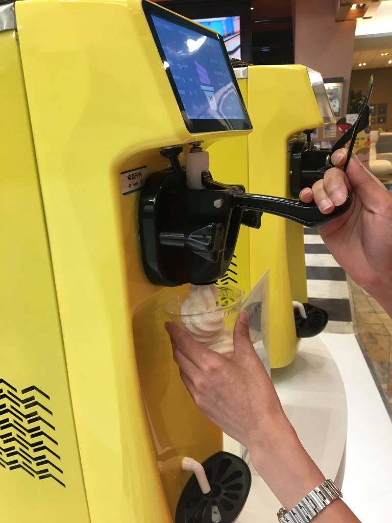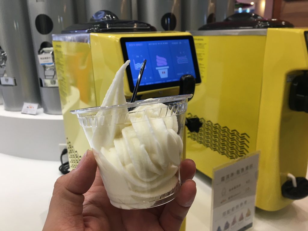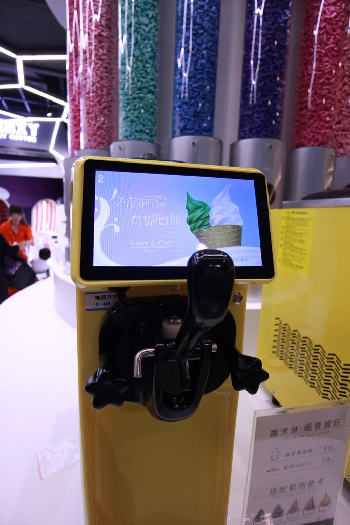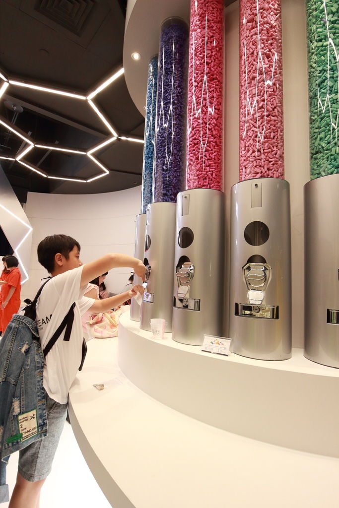 ▲忘了提到入口的巨大彩色柱地標,相當引人注目的霜淇淋販賣機,跟櫃檯買完杯子,服務人員會幫忙裝入冰淇淋,其他配料你只要投入10元就可以選擇,你也可以多投幾個10元,混搭一下綜合冰淇淋。