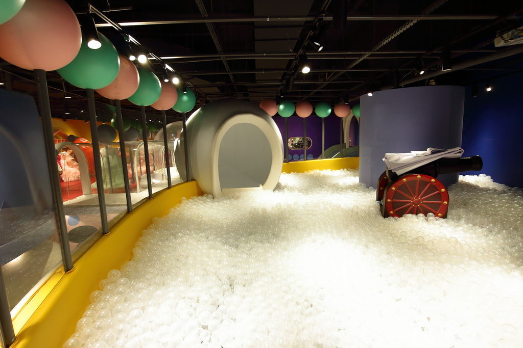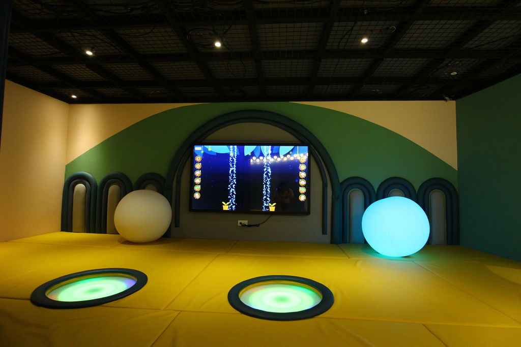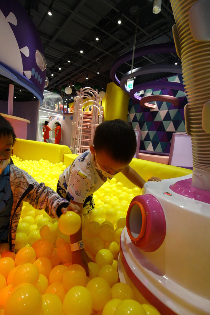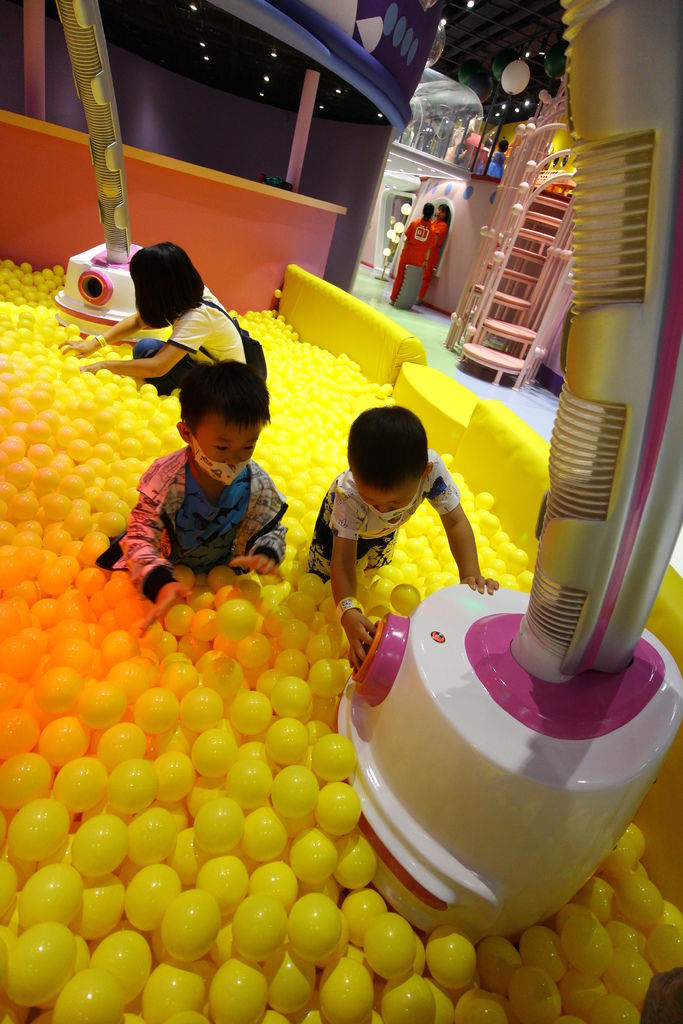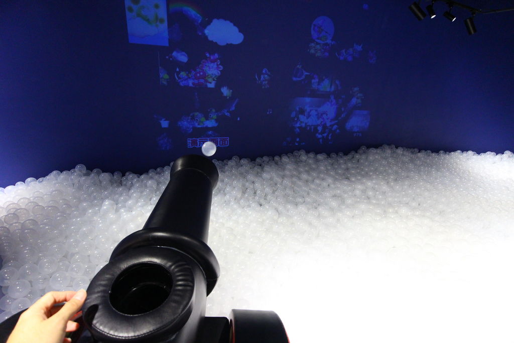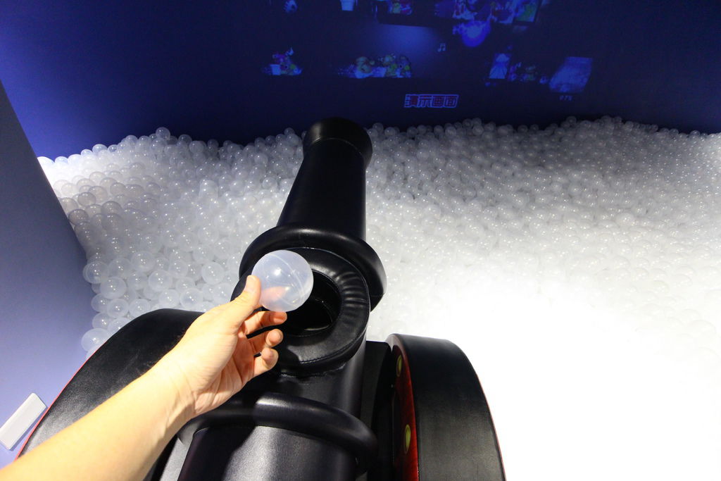 ▲時代城/銀星泡泡湖,另一個選擇就是到銀星泡泡湖,滿滿夢幻的泡泡球就像泡在池子裡,利用這邊的泡泡加農砲砲擊投影幕內的海盜,兩個小朋友可以合作,一人投放一人發射,利用互動科技練習分工合作。