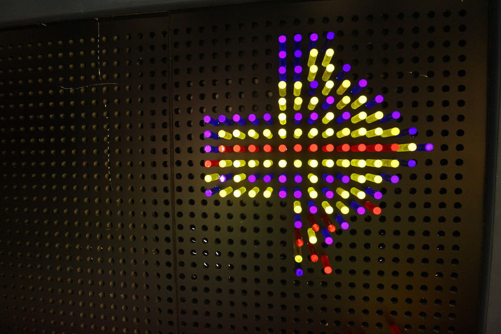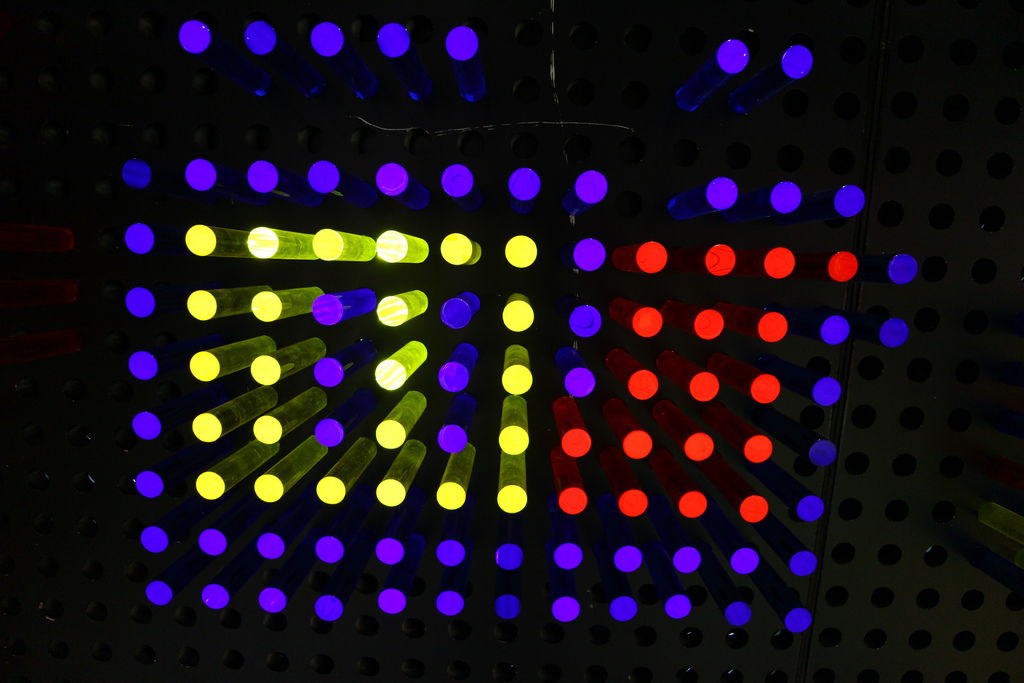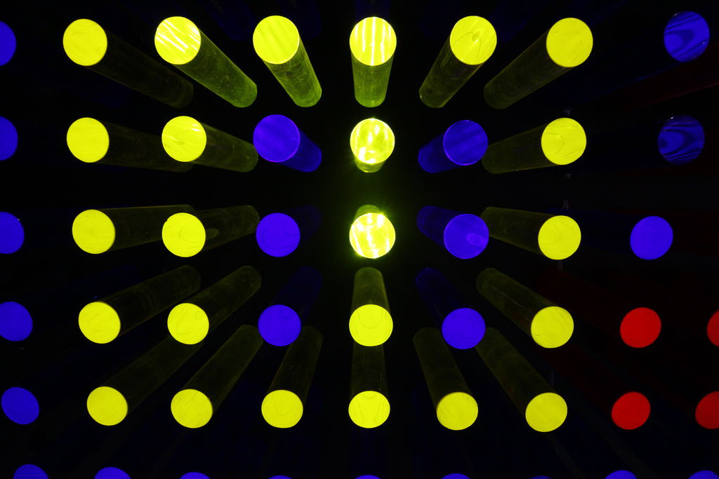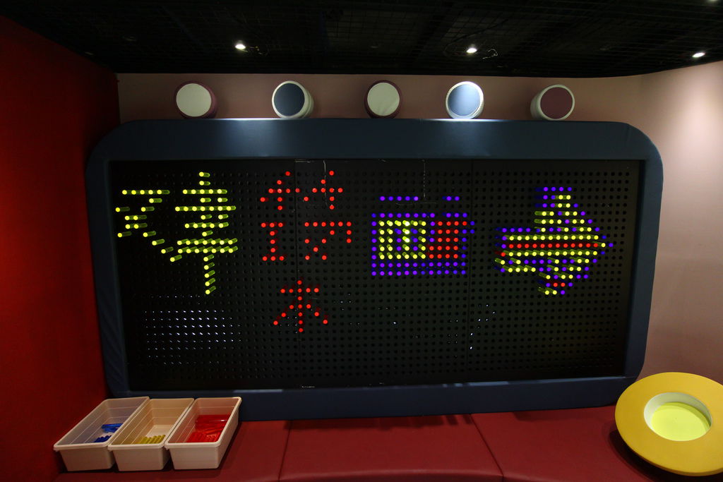 ▲時代城/星光互動區,接著往下走來到星光互動區,三種顏色的棒子透過光產生出光感繽紛的亮光牆,大小朋友都能在這激發出不同的創意感受。