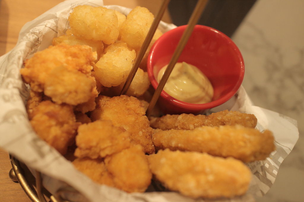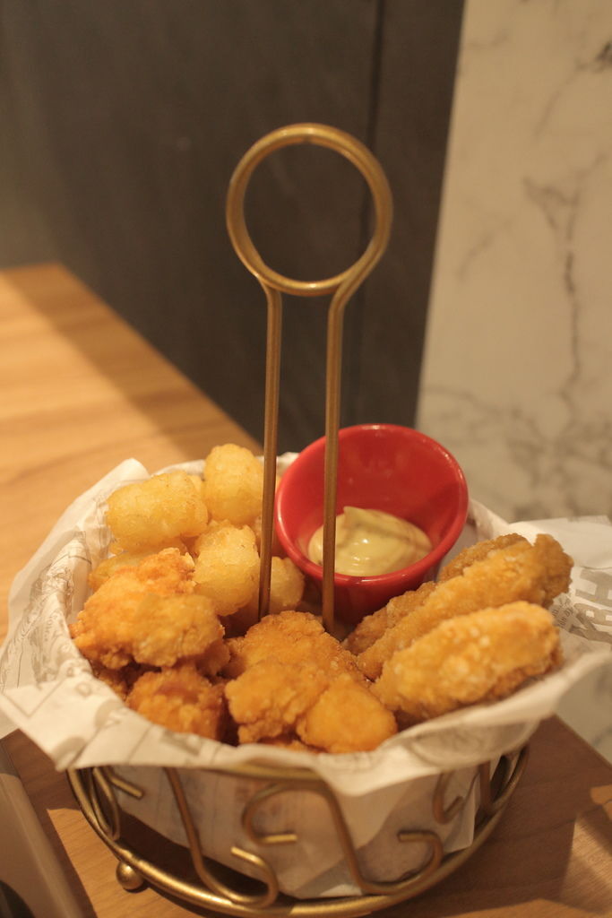 ▲炸物三拼($199),雞米花、雞柳跟薯球拼湊而成的炸物三拼,雞柳被包覆下去炸之後,肉汁全鎖在裡頭,咬下去會感覺到肉汁的美味口感,薯球就如菜單所說很像是乖乖耶,別以為吃下去是椰子味,咬下可是濃厚的馬鈴薯。