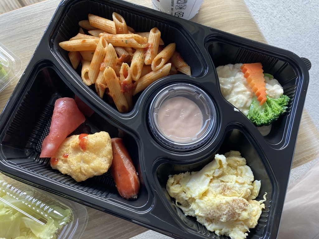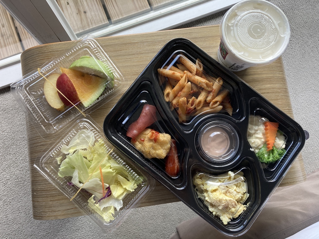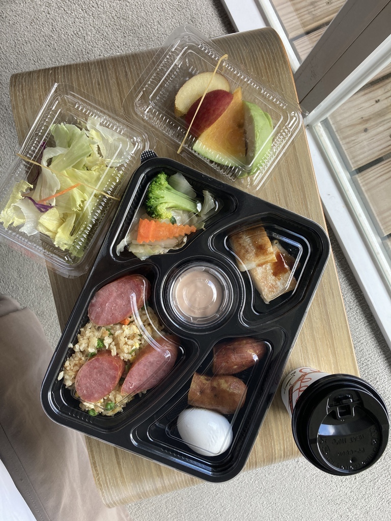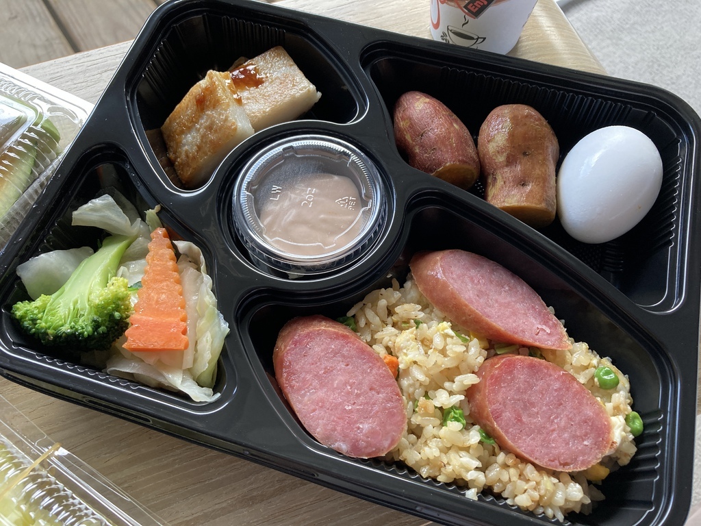 ▲早餐在大廳領取,因為疫情的關係並沒有開放餐廳用餐,而是以餐盒的方式,雖是用餐盒倒也是不馬虎,分為西式與台式,台式有炒飯搭配蘿蔔糕、地瓜,西式則是筆管麵搭配炒蛋,兩種都好吃且份量十足,並不會因為是餐盒而使得餐點縮水。
