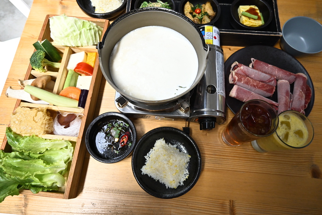 ▲香醇牛奶鍋($450),鍋底的牛奶味濃厚,舀起來的湯汁融入豬肉片當中,覺得湯頭非常不錯,一鍋450元分量適中,擺盤與非常漂亮。