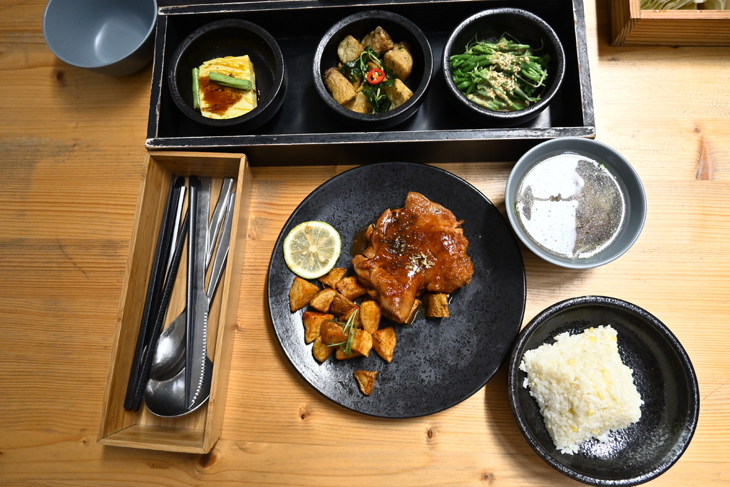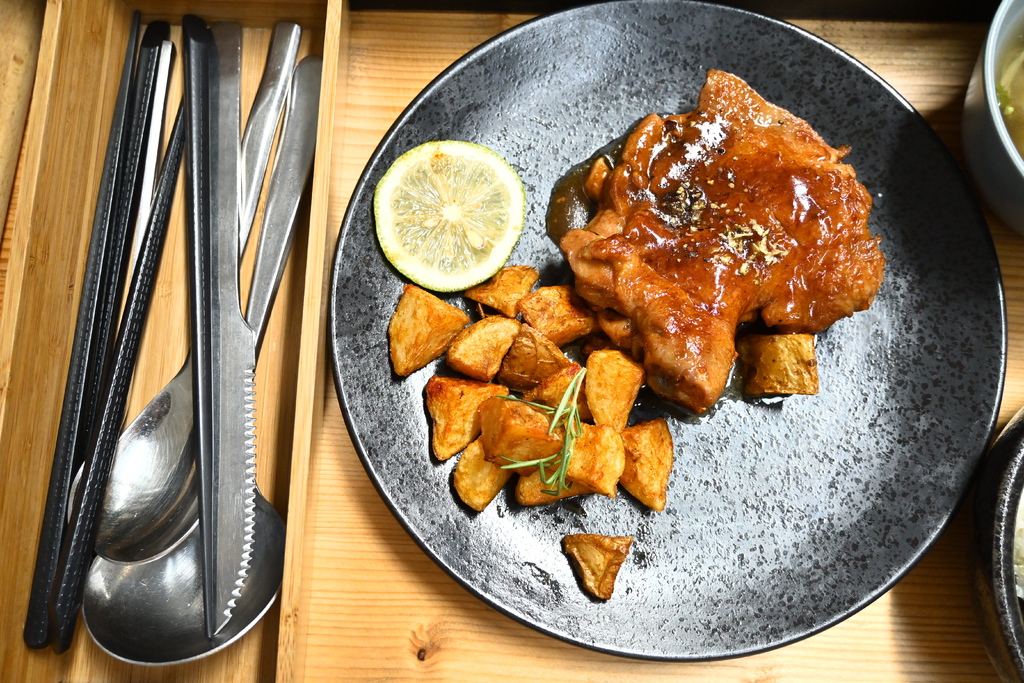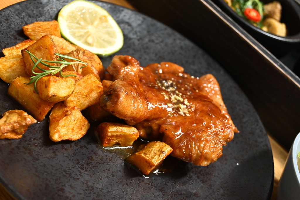 ▲鄉間嫩雞腿排($420),雞腿排醬汁好好吃喔,切下一小塊雞腿配飯吃非常夠味,雞腿肉鮮嫩無比,還有薯塊跟小菜搭配,我覺得這道定食必點好吃。