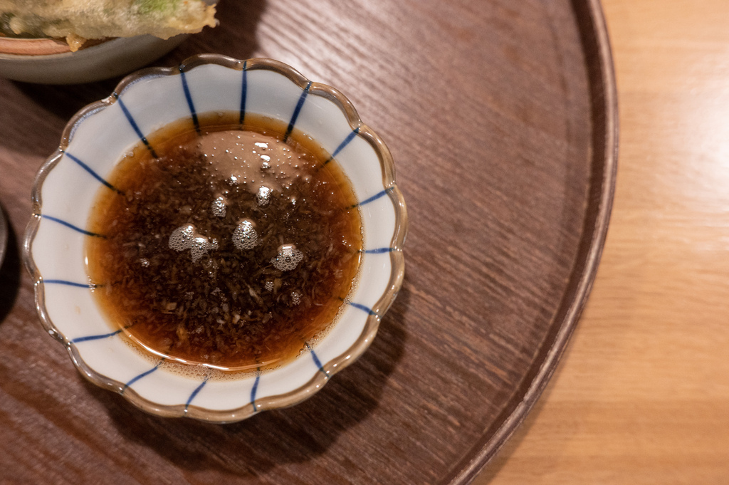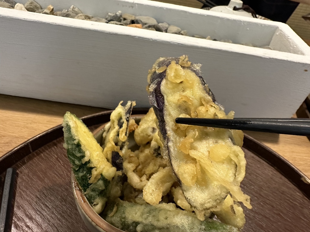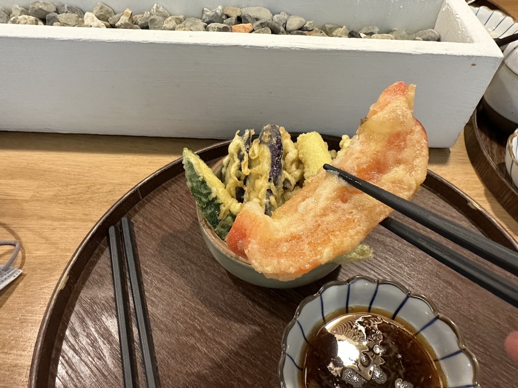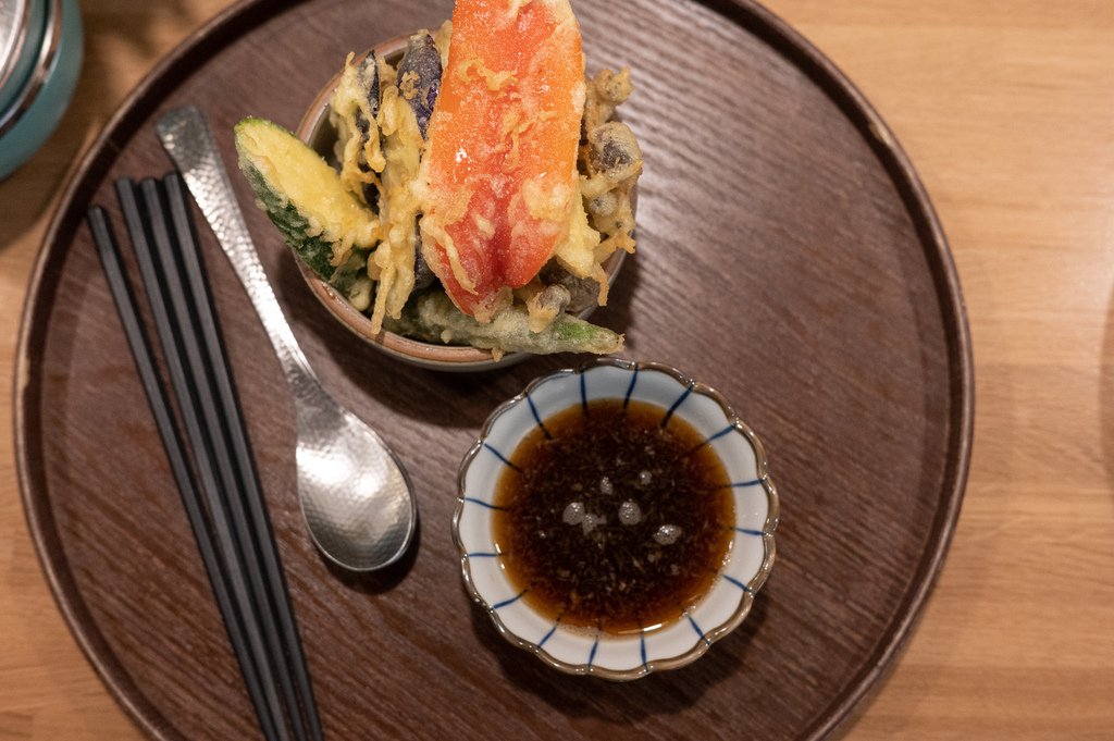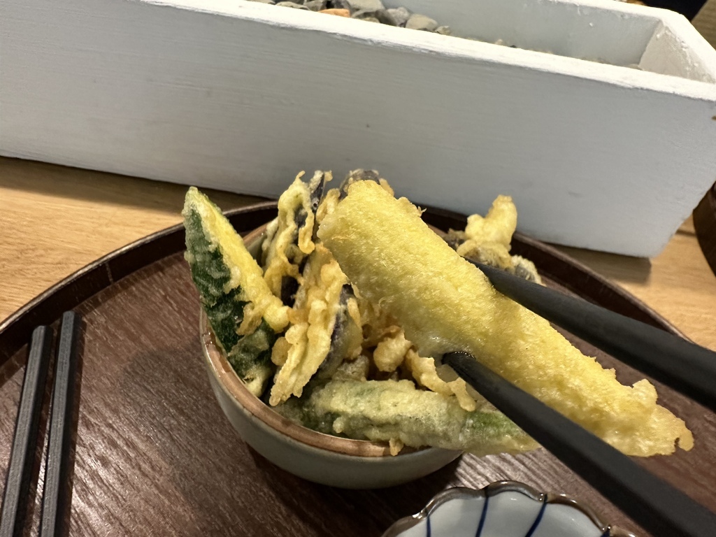 ▲炸時蔬($80),點份炸時蔬來試看看炸物的味道,內容物是茄子、青椒還有玉米筍,沾點醬汁,讓醬汁滲入時蔬中增添風味。