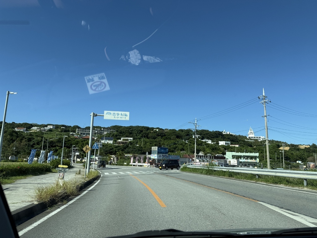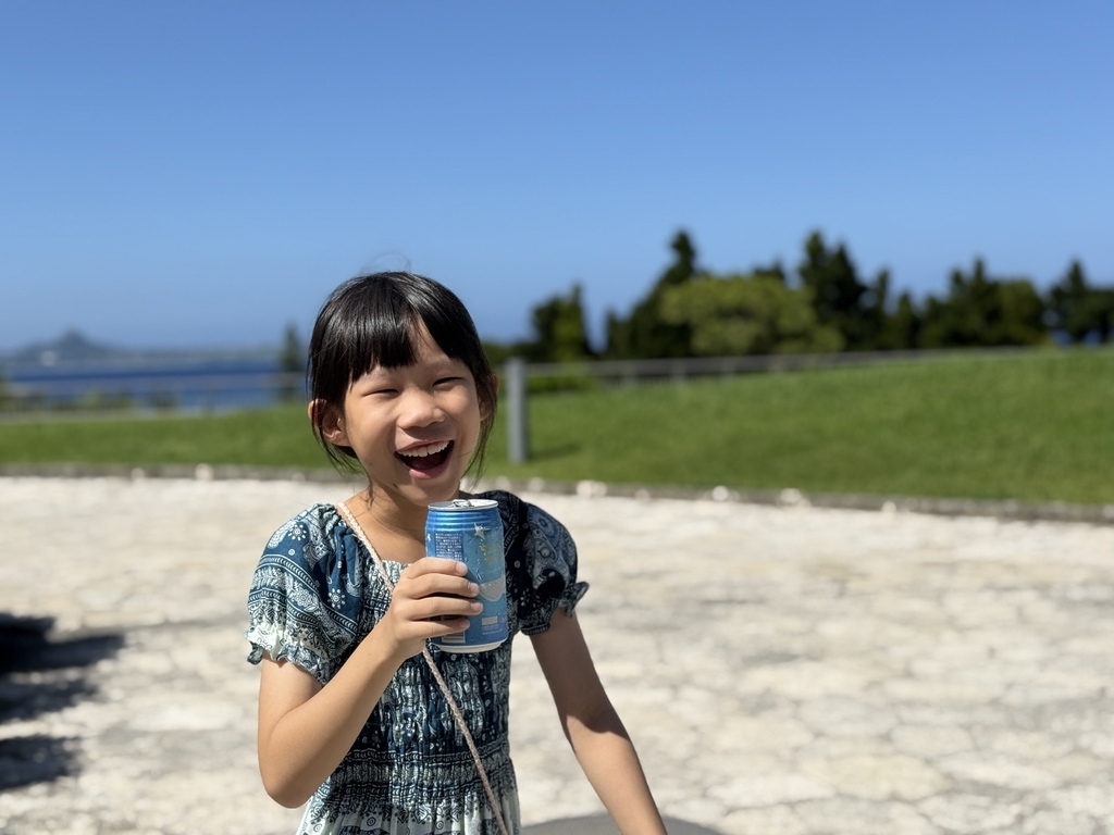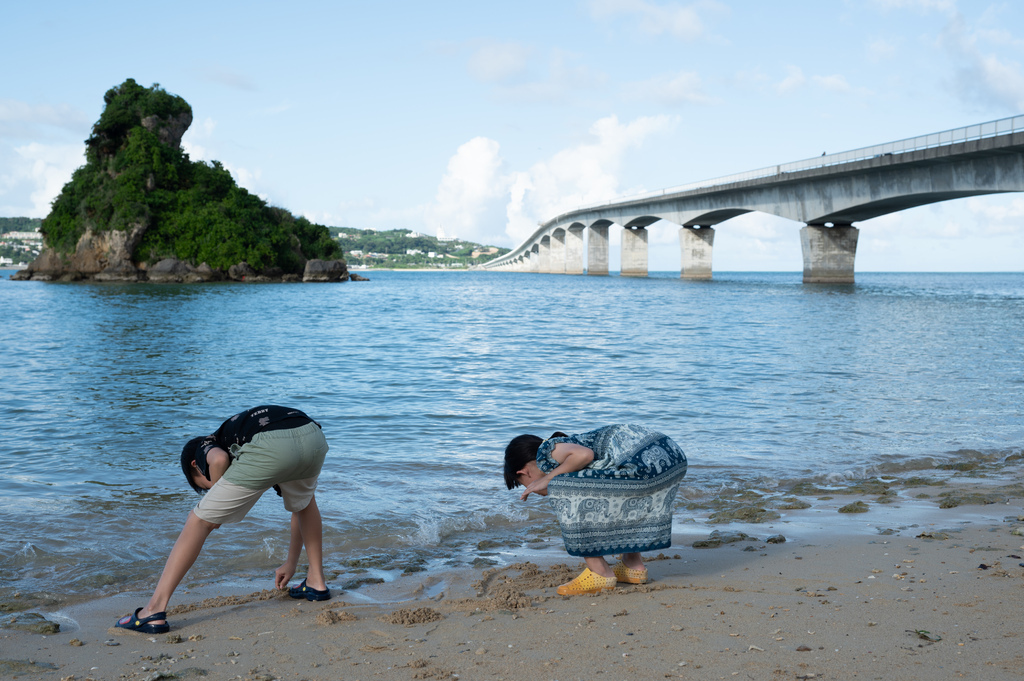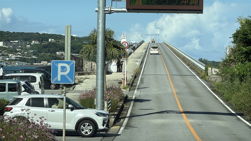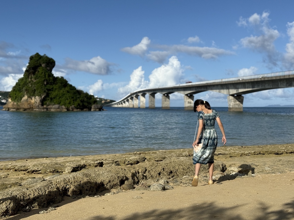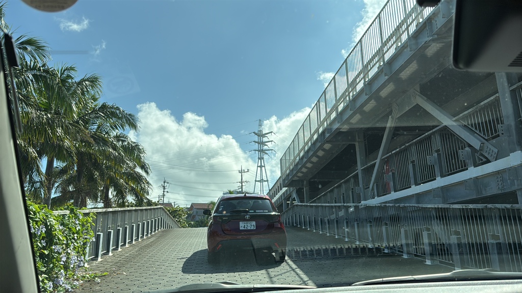 ▲回程途中,我們特地停在古宇利大橋南端的觀景台稍作休息。這裡視野絕佳,小朋友玩得不亦樂乎,踩沙、踢水,無憂無慮地享受著清澈海水與微風輕拂。遊客不多,氣氛相當悠閒,停車也很方便,是個放鬆的好地方。不過,因為晚上要趕回市區還車,我們不敢耽擱太久。踩踩水後便匆匆啟程,開始了90公里的返程之旅。一路上,腦中反覆盤算著加油站的位置與還車的時間,雖然有些緊張,但回望這趟旅途的美景與回憶,疲憊中也多了一絲甘甜。